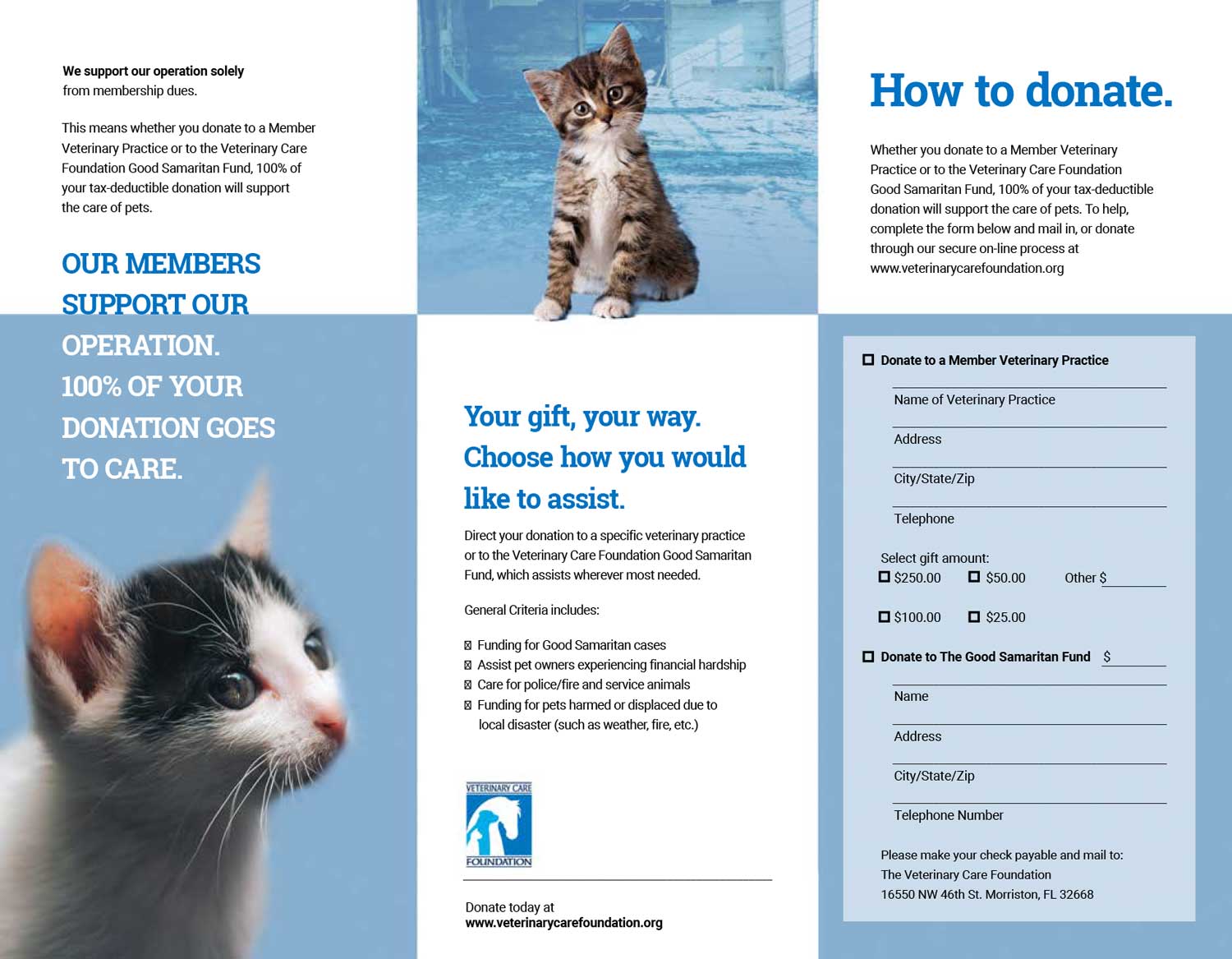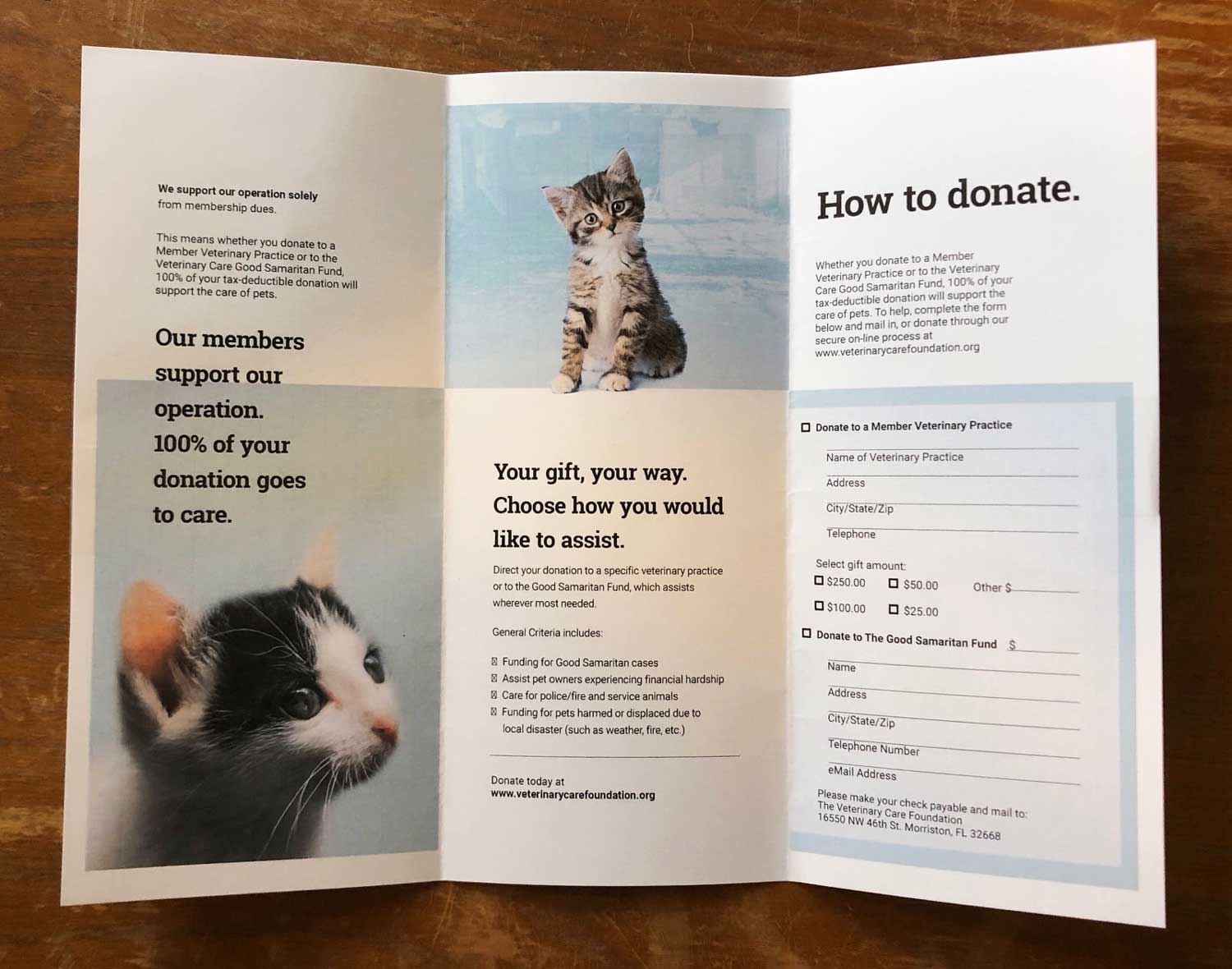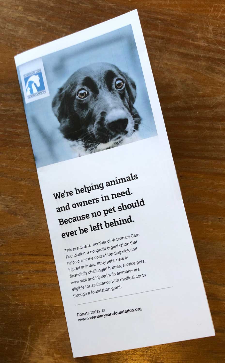 Full-color brochures tell potential donors all about VCF and how their donation helps your practice.